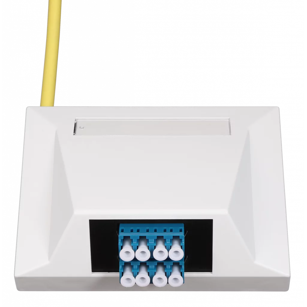 NCS Fiber vegguttak 4-fiber er en universalboks for montering på vegg eller på kanal med vinklet fiberutgang for mindre belastning på patchkabel. Uttaket er tilrettelagt for både direkteterminering med NCS UniCam og for sveising av fiberhaler.