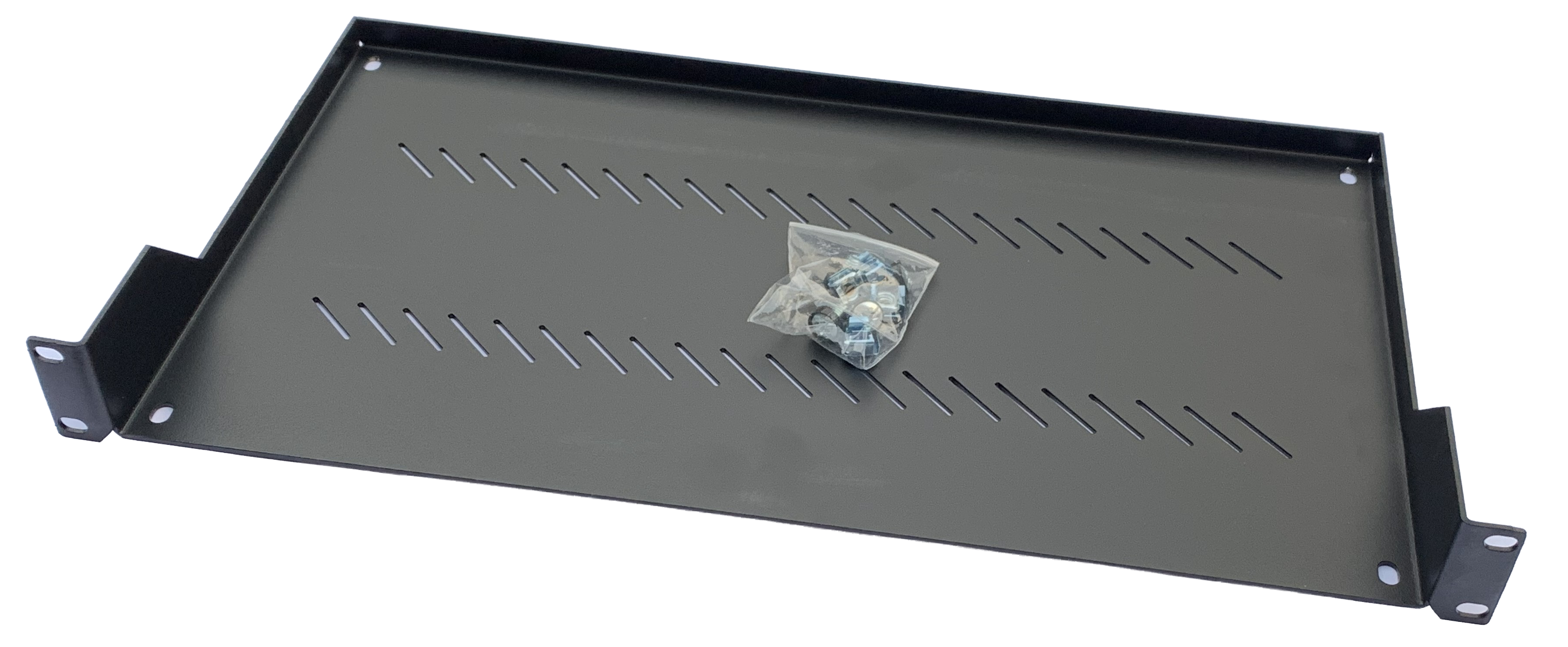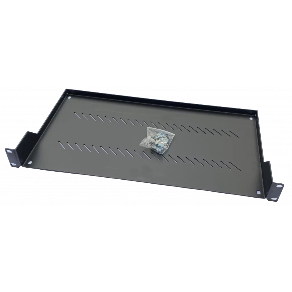 Ventilert frontmontert hylle produsert i galvanisert stål. Hylla monteres i 19" profiler foran i skap. Skruesett for montering er inkludert.