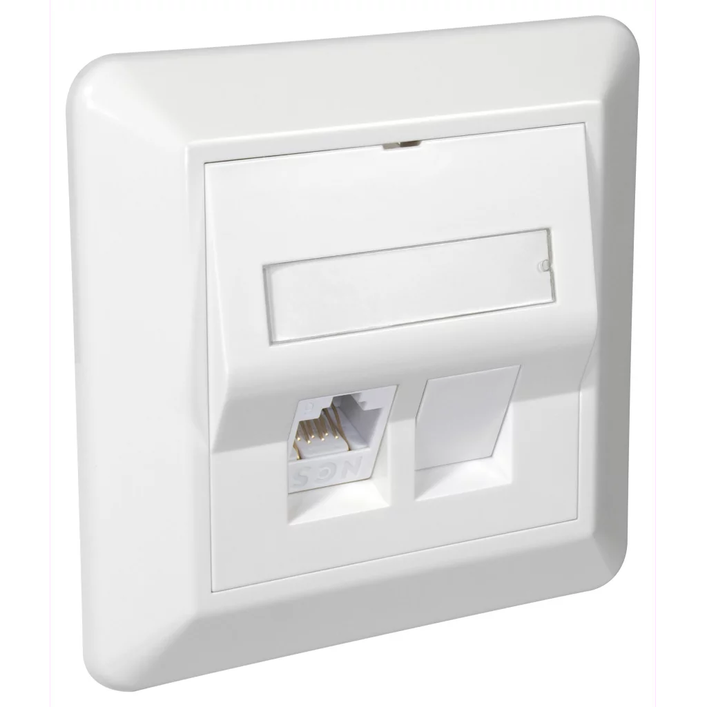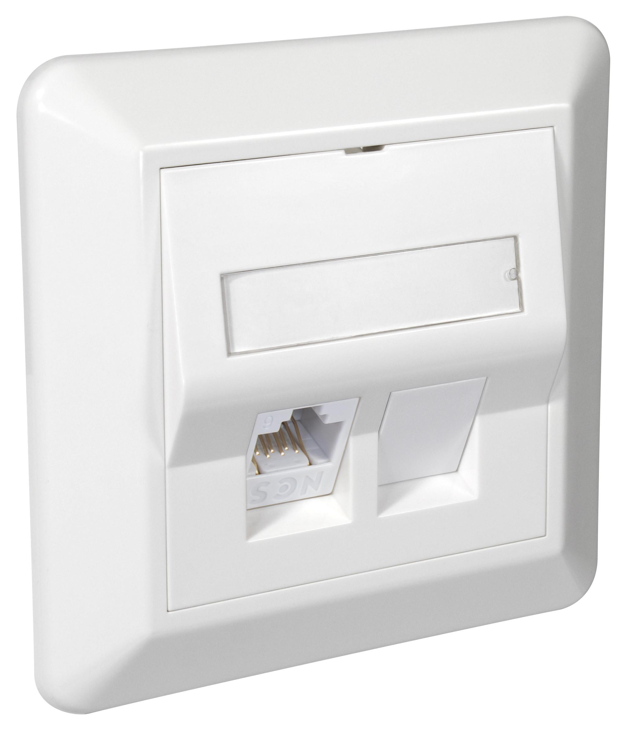 NCS Vegguttak QuickCompact RS Skrå Polarhvit - QuickCompact Rask terminering på 1-2-3 - Termineringsverktøy forhindrer ubalanse i DCLR for sikker PoE - Støtter IEC 60512-99-002 mot skadelig lysbue for PoE opp til 90W / 2A - Senterplate passer i RS og Plus rammer og påveggskapper - Festes i kanal med