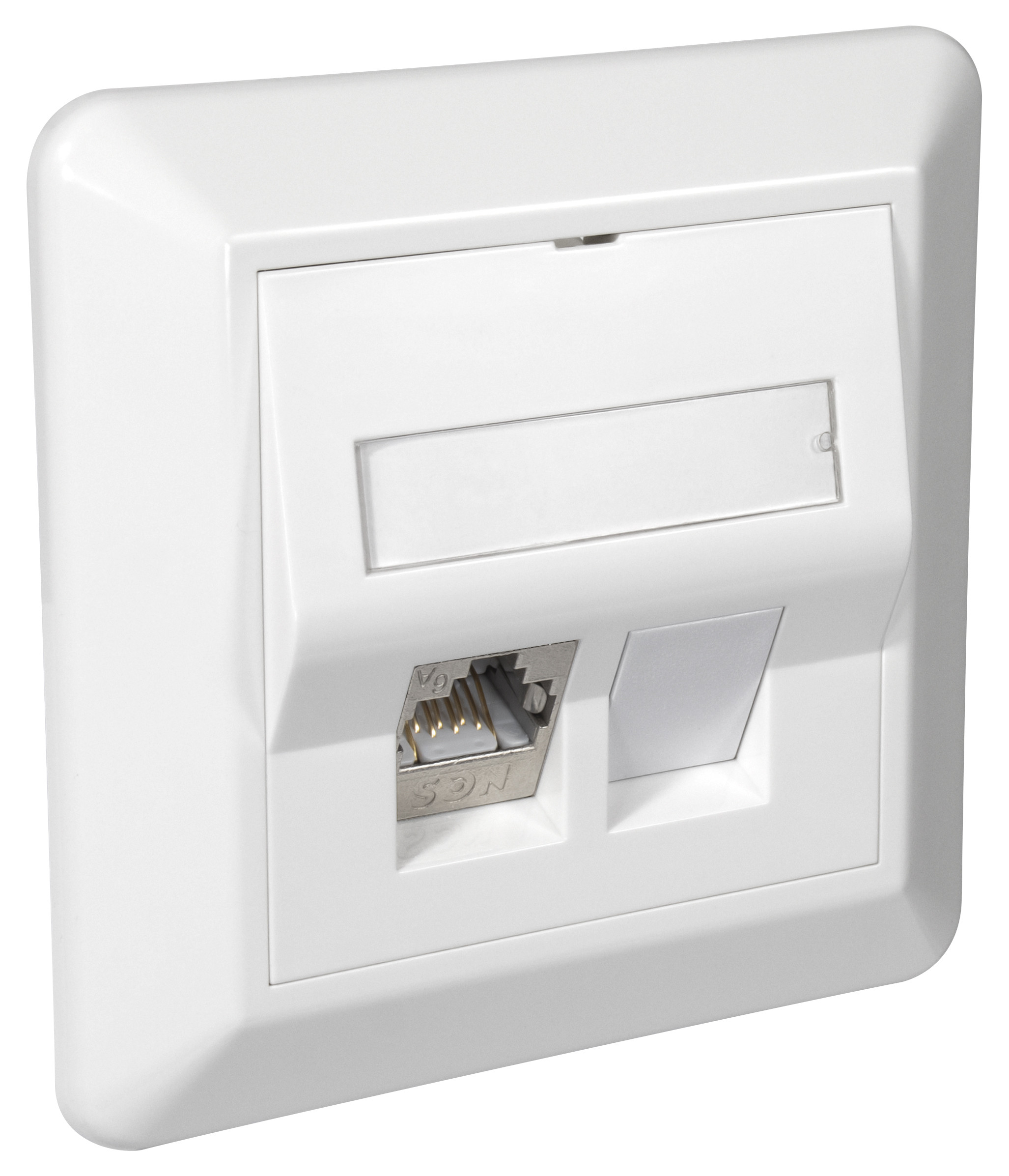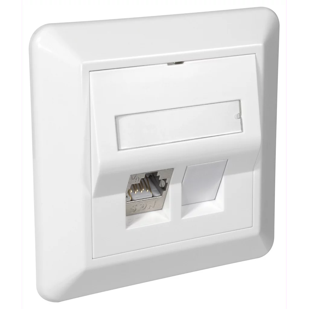 NCS Vegguttak QuickCompact RS Skrå Polarhvit - QuickCompact Rask terminering på 1-2-3 - Termineringsverktøy forhindrer ubalanse i DCLR for sikker PoE - Støtter IEC 60512-99-002 mot skadelig lysbue for PoE opp til 90W / 2A - Senterplate passer i RS og Plus rammer og påveggskapper - Festes i kanal